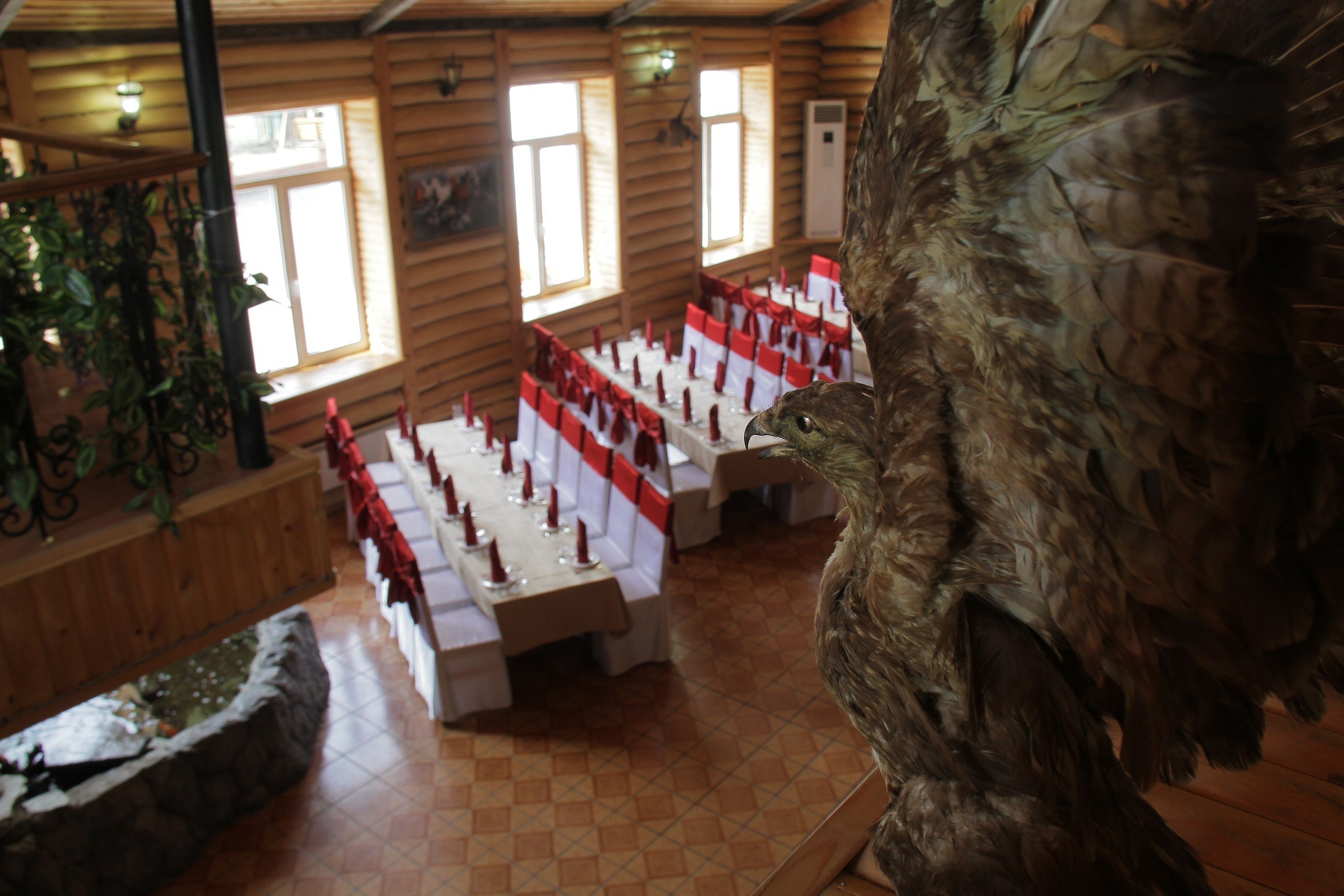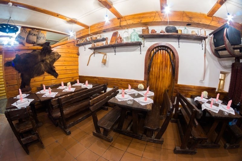 Мало того, что ресторанный комплекс может предоставить целых пятнадцать банкетных залов, так ещё один из них — настоящая охотничья комната с массивными деревянными стульями и столами. Именно в ней можно подкрепиться в компании трофейных птиц, лосей, кабанов и медвежьей шкуры. А интерьер вида лубяной избы с мягким светом, по идее, должен создавать ощущение уюта. Впрочем, в зале есть отдельные комнаты, где из развлечений на стенах только окна.