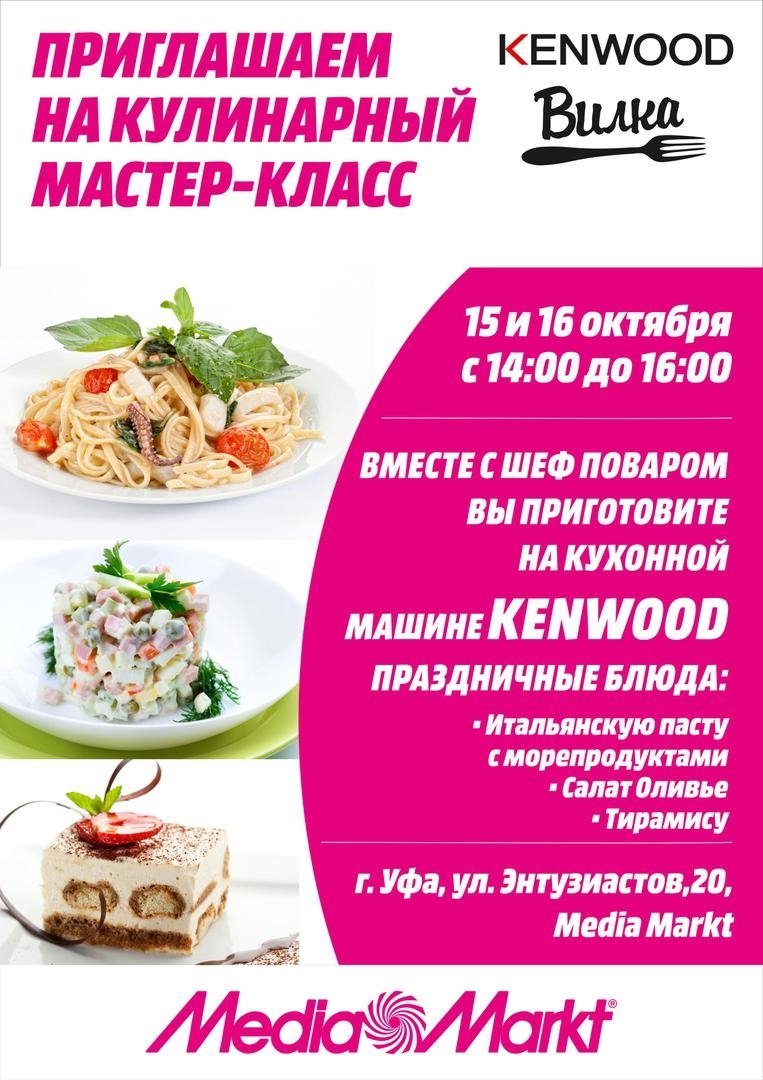 Готовить будут на территории Media Markt с помощью кухонных машин, всё серьёзно. В меню — итальянская паста с морепродуктами, салат оливье и десерт Тирамису. Так как мастер-класс демонстрационный, большинству удастся лишь увидеть, как правильно готовить эти блюда, непосредственно в приготовлении смогут поучаствовать несколько человек.