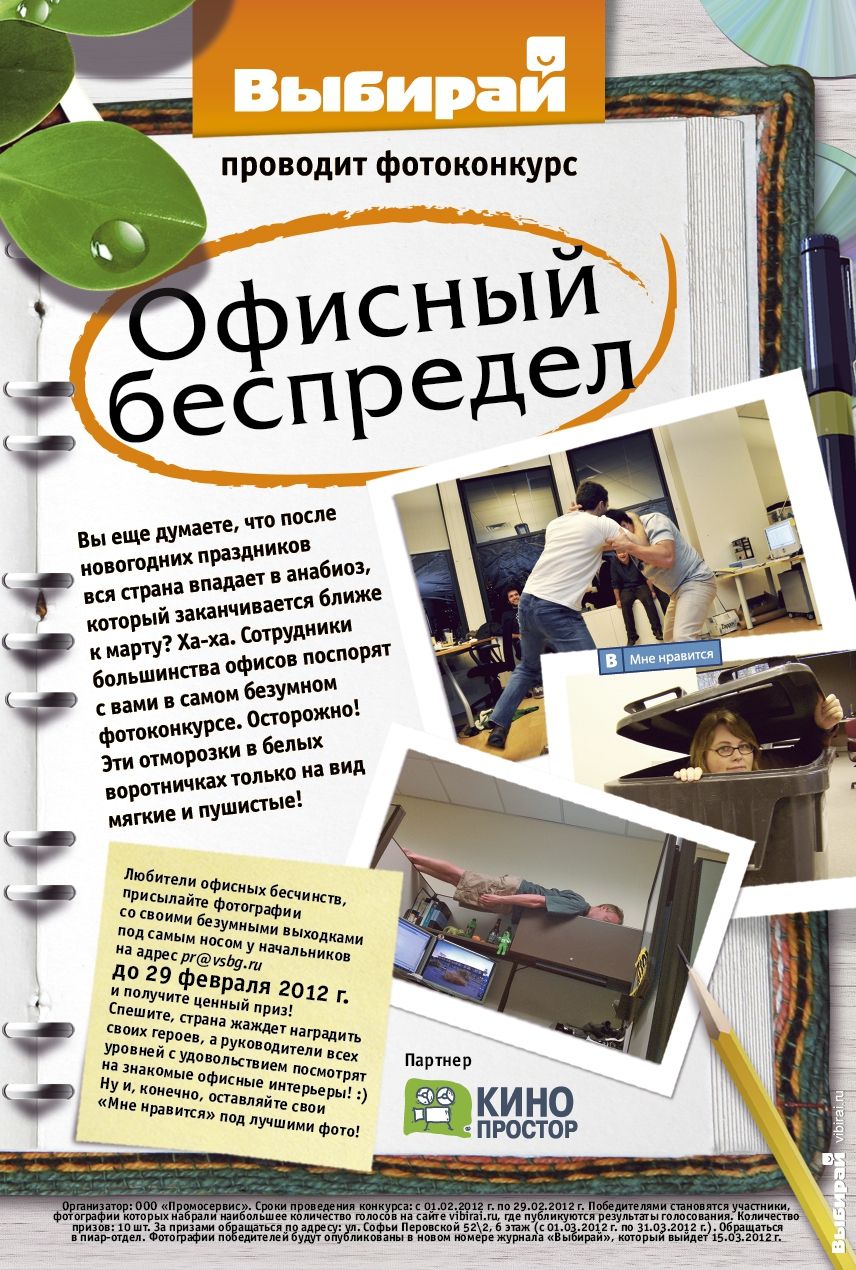 Любители офисных шуток, присылайте фотографии со своими безумными выходками на адрес pr@vsbg.ru до 29 февраля, пригласите своих друзей и коллег голосовать за вас и получите ценный приз! Спешите, страна жаждет наградить своих героев, а руководители всех уровней с удовольствием посмотрят на знакомые офисные интерьеры! :)